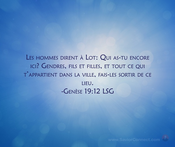 Les hommes dirent à Lot: Qui as-tu encore ici? Gendres, fils et filles, et tout ce qui t'appartient dans la ville, fais-les sortir de ce lieu. -Genèse 19:12 LSG