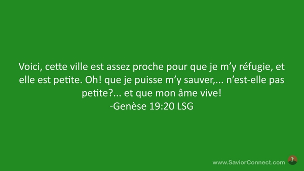 Voici, cette ville est assez proche pour que je m'y réfugie, et elle est petite. Oh! que je puisse m'y sauver,... n'est-elle pas petite?... et que mon âme vive! -Genèse 19:20 LSG