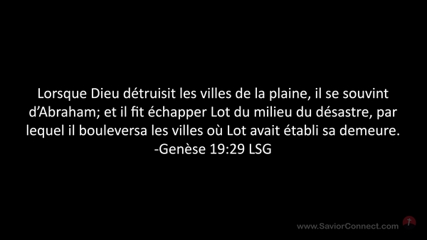 Lorsque Dieu détruisit les villes de la plaine, il se souvint d'Abraham; et il fit échapper Lot du milieu du désastre, par lequel il bouleversa les villes où Lot avait établi sa demeure. -Genèse 19:29 LSG
