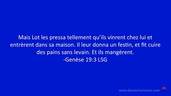 Mais Lot les pressa tellement qu'ils vinrent chez lui et entrèrent dans sa maison. Il leur donna un festin, et fit cuire des pains sans levain. Et ils mangèrent. -Genèse 19:3 LSG