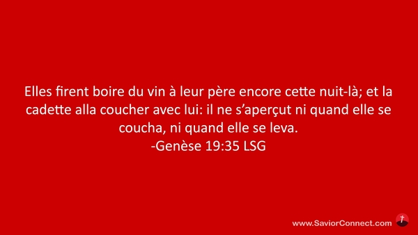 Elles firent boire du vin à leur père encore cette nuit-là; et la cadette alla coucher avec lui: il ne s'aperçut ni quand elle se coucha, ni quand elle se leva. -Genèse 19:35 LSG