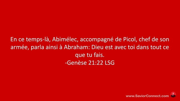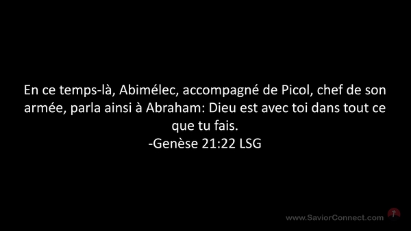En ce temps-là, Abimélec, accompagné de Picol, chef de son armée, parla ainsi à Abraham: Dieu est avec toi dans tout ce que tu fais. -Genèse 21:22 LSG