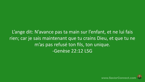 L'ange dit: N'avance pas ta main sur l'enfant, et ne lui fais rien; car je sais maintenant que tu crains Dieu, et que tu ne m'as pas refusé ton fils, ton unique. -Genèse 22:12 LSG