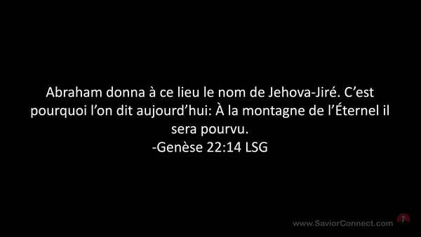 Abraham donna à ce lieu le nom de Jehova-Jiré. C'est pourquoi l'on dit aujourd'hui: À la montagne de l'Éternel il sera pourvu. -Genèse 22:14 LSG