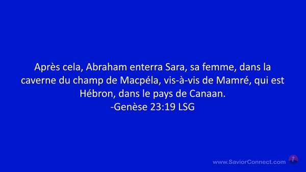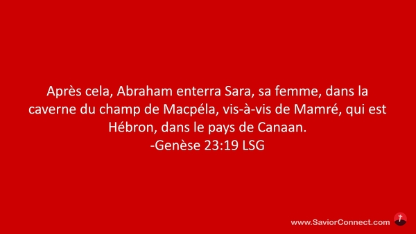 Après cela, Abraham enterra Sara, sa femme, dans la caverne du champ de Macpéla, vis-à-vis de Mamré, qui est Hébron, dans le pays de Canaan. -Genèse 23:19 LSG