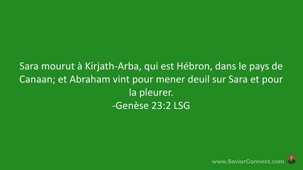 Sara mourut à Kirjath-Arba, qui est Hébron, dans le pays de Canaan; et Abraham vint pour mener deuil sur Sara et pour la pleurer. -Genèse 23:2 LSG