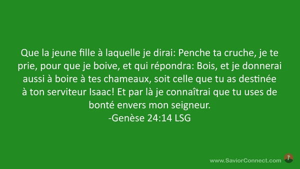 Que la jeune fille à laquelle je dirai: Penche ta cruche, je te prie, pour que je boive, et qui répondra: Bois, et je donnerai aussi à boire à tes chameaux, soit celle que tu as destinée à ton serviteur Isaac! Et par là je connaîtrai que tu uses de bonté envers mon seigneur. -Genèse 24:14 LSG