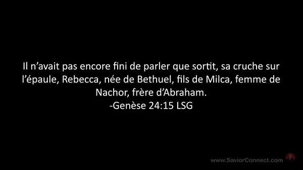 Il n'avait pas encore fini de parler que sortit, sa cruche sur l'épaule, Rebecca, née de Bethuel, fils de Milca, femme de Nachor, frère d'Abraham. -Genèse 24:15 LSG