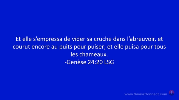 Et elle s'empressa de vider sa cruche dans l'abreuvoir, et courut encore au puits pour puiser; et elle puisa pour tous les chameaux. -Genèse 24:20 LSG
