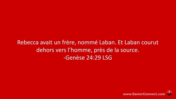 Rebecca avait un frère, nommé Laban. Et Laban courut dehors vers l'homme, près de la source. -Genèse 24:29 LSG