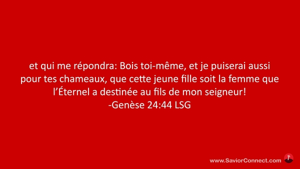 et qui me répondra: Bois toi-même, et je puiserai aussi pour tes chameaux, que cette jeune fille soit la femme que l'Éternel a destinée au fils de mon seigneur! -Genèse 24:44 LSG