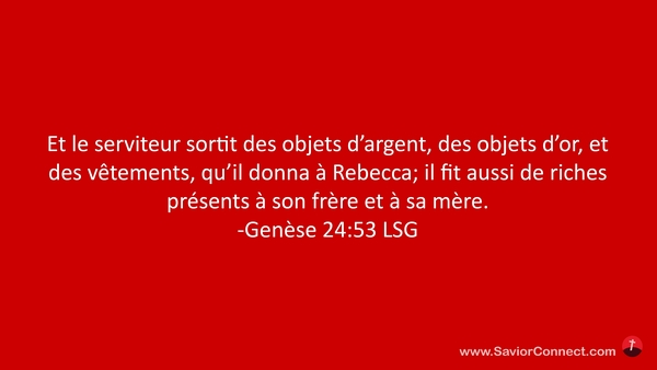 Et le serviteur sortit des objets d'argent, des objets d'or, et des vêtements, qu'il donna à Rebecca; il fit aussi de riches présents à son frère et à sa mère. -Genèse 24:53 LSG