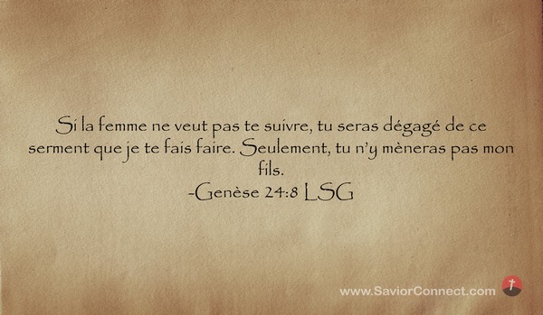 Si la femme ne veut pas te suivre, tu seras dégagé de ce serment que je te fais faire. Seulement, tu n'y mèneras pas mon fils. -Genèse 24:8 LSG
