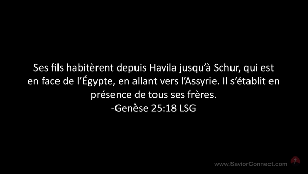 Ses fils habitèrent depuis Havila jusqu'à Schur, qui est en face de l'Égypte, en allant vers l'Assyrie. Il s'établit en présence de tous ses frères. -Genèse 25:18 LSG