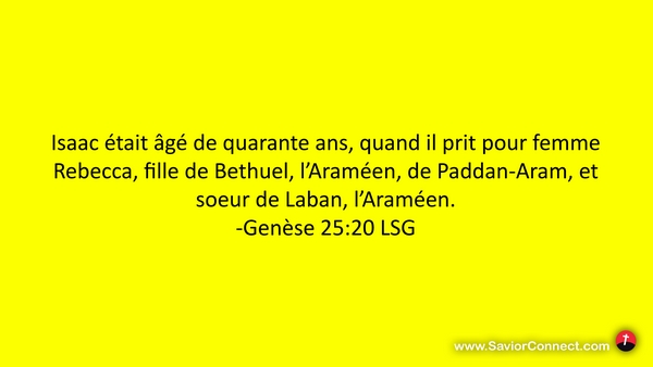 Isaac était âgé de quarante ans, quand il prit pour femme Rebecca, fille de Bethuel, l'Araméen, de Paddan-Aram, et soeur de Laban, l'Araméen. -Genèse 25:20 LSG