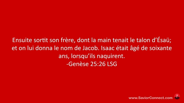 Ensuite sortit son frère, dont la main tenait le talon d'Ésaü; et on lui donna le nom de Jacob. Isaac était âgé de soixante ans, lorsqu'ils naquirent. -Genèse 25:26 LSG