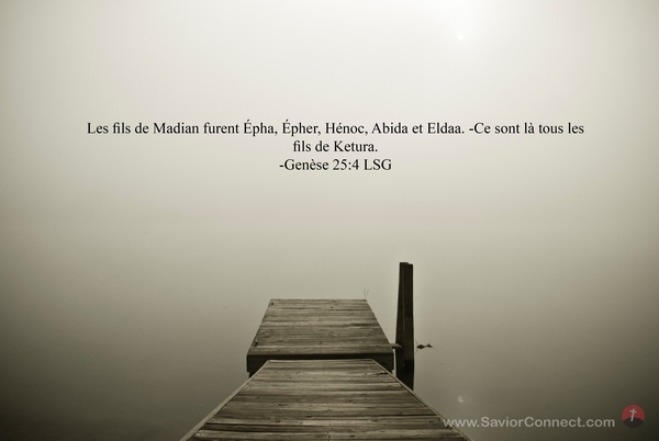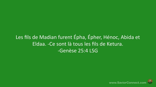 Les fils de Madian furent Épha, Épher, Hénoc, Abida et Eldaa. -Ce sont là tous les fils de Ketura. -Genèse 25:4 LSG