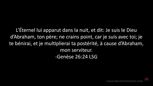 L'Éternel lui apparut dans la nuit, et dit: Je suis le Dieu d'Abraham, ton père; ne crains point, car je suis avec toi; je te bénirai, et je multiplierai ta postérité, à cause d'Abraham, mon serviteur. -Genèse 26:24 LSG