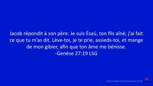 Jacob répondit à son père: Je suis Ésaü, ton fils aîné; j'ai fait ce que tu m'as dit. Lève-toi, je te prie, assieds-toi, et mange de mon gibier, afin que ton âme me bénisse. -Genèse 27:19 LSG