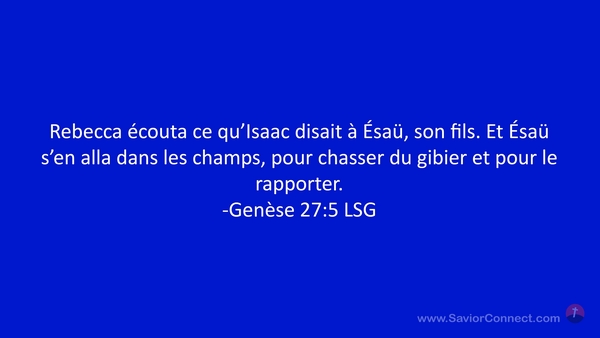 Rebecca écouta ce qu'Isaac disait à Ésaü, son fils. Et Ésaü s'en alla dans les champs, pour chasser du gibier et pour le rapporter. -Genèse 27:5 LSG