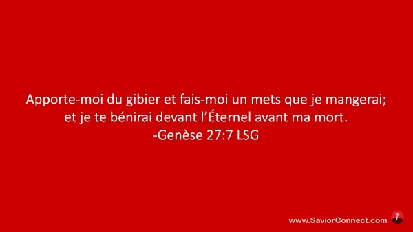 Apporte-moi du gibier et fais-moi un mets que je mangerai; et je te bénirai devant l'Éternel avant ma mort. -Genèse 27:7 LSG