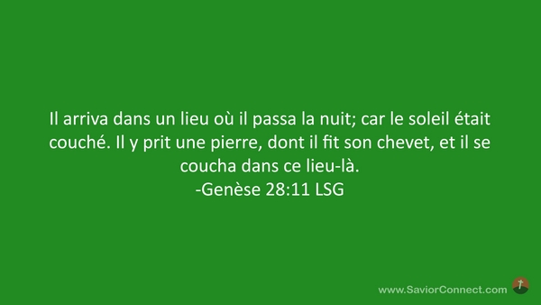 Il arriva dans un lieu où il passa la nuit; car le soleil était couché. Il y prit une pierre, dont il fit son chevet, et il se coucha dans ce lieu-là. -Genèse 28:11 LSG
