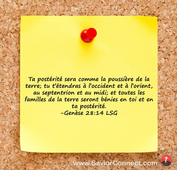 Ta postérité sera comme la poussière de la terre; tu t'étendras à l'occident et à l'orient, au septentrion et au midi; et toutes les familles de la terre seront bénies en toi et en ta postérité. -Genèse 28:14 LSG