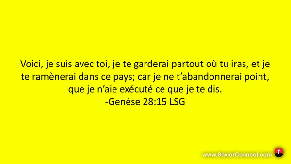 Voici, je suis avec toi, je te garderai partout où tu iras, et je te ramènerai dans ce pays; car je ne t'abandonnerai point, que je n'aie exécuté ce que je te dis. -Genèse 28:15 LSG