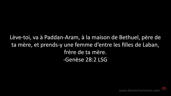 Lève-toi, va à Paddan-Aram, à la maison de Bethuel, père de ta mère, et prends-y une femme d'entre les filles de Laban, frère de ta mère. -Genèse 28:2 LSG