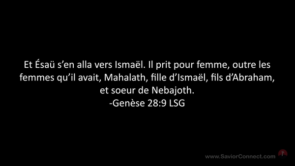 Et Ésaü s'en alla vers Ismaël. Il prit pour femme, outre les femmes qu'il avait, Mahalath, fille d'Ismaël, fils d'Abraham, et soeur de Nebajoth. -Genèse 28:9 LSG