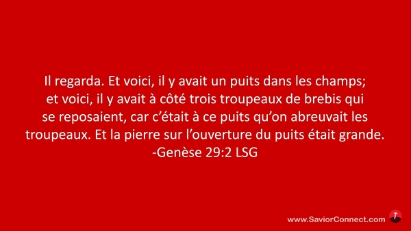 Il regarda. Et voici, il y avait un puits dans les champs; et voici, il y avait à côté trois troupeaux de brebis qui se reposaient, car c'était à ce puits qu'on abreuvait les troupeaux. Et la pierre sur l'ouverture du puits était grande. -Genèse 29:2 LSG