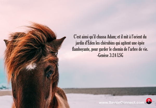 C'est ainsi qu'il chassa Adam; et il mit à l'orient du jardin d'Éden les chérubins qui agitent une épée flamboyante, pour garder le chemin de l'arbre de vie. -Genèse 3:24 LSG