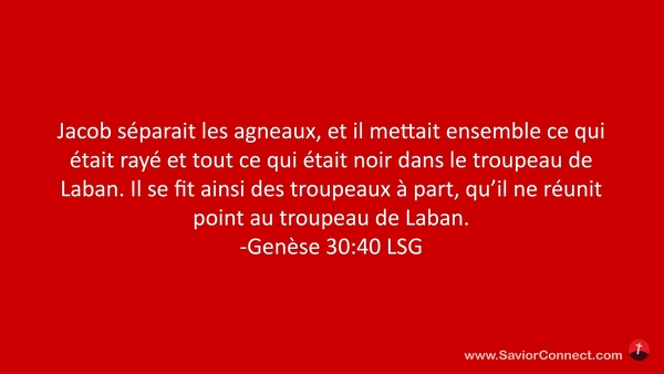 Jacob séparait les agneaux, et il mettait ensemble ce qui était rayé et tout ce qui était noir dans le troupeau de Laban. Il se fit ainsi des troupeaux à part, qu'il ne réunit point au troupeau de Laban. -Genèse 30:40 LSG