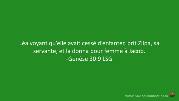 Léa voyant qu'elle avait cessé d'enfanter, prit Zilpa, sa servante, et la donna pour femme à Jacob. -Genèse 30:9 LSG
