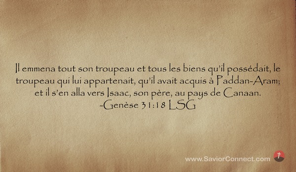 Il emmena tout son troupeau et tous les biens qu'il possédait, le troupeau qui lui appartenait, qu'il avait acquis à Paddan-Aram; et il s'en alla vers Isaac, son père, au pays de Canaan. -Genèse 31:18 LSG
