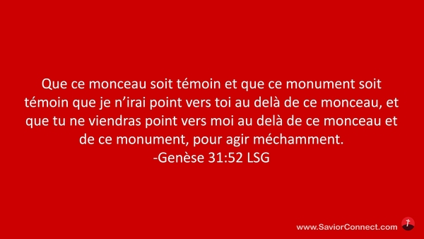 Que ce monceau soit témoin et que ce monument soit témoin que je n'irai point vers toi au delà de ce monceau, et que tu ne viendras point vers moi au delà de ce monceau et de ce monument, pour agir méchamment. -Genèse 31:52 LSG