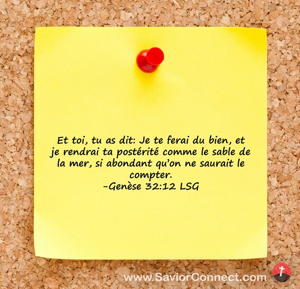 Et toi, tu as dit: Je te ferai du bien, et je rendrai ta postérité comme le sable de la mer, si abondant qu'on ne saurait le compter. -Genèse 32:12 LSG