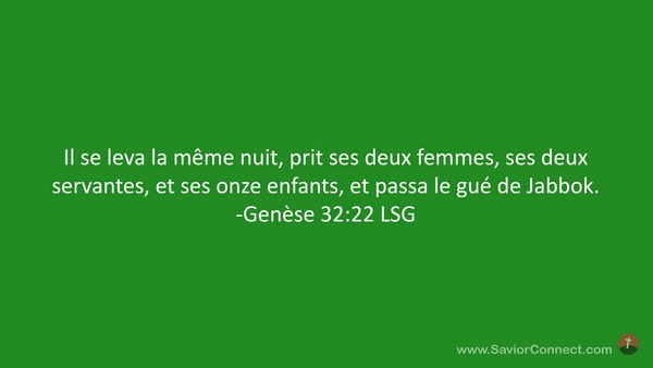 Il se leva la même nuit, prit ses deux femmes, ses deux servantes, et ses onze enfants, et passa le gué de Jabbok. -Genèse 32:22 LSG