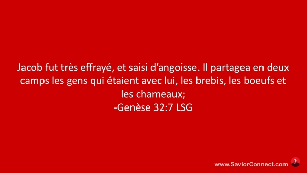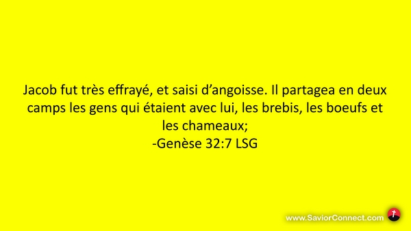 Jacob fut très effrayé, et saisi d'angoisse. Il partagea en deux camps les gens qui étaient avec lui, les brebis, les boeufs et les chameaux; -Genèse 32:7 LSG