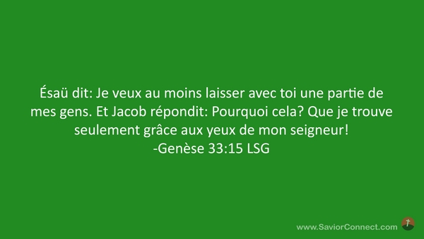 Ésaü dit: Je veux au moins laisser avec toi une partie de mes gens. Et Jacob répondit: Pourquoi cela? Que je trouve seulement grâce aux yeux de mon seigneur! -Genèse 33:15 LSG