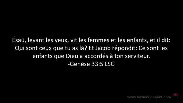 Ésaü, levant les yeux, vit les femmes et les enfants, et il dit: Qui sont ceux que tu as là? Et Jacob répondit: Ce sont les enfants que Dieu a accordés à ton serviteur. -Genèse 33:5 LSG