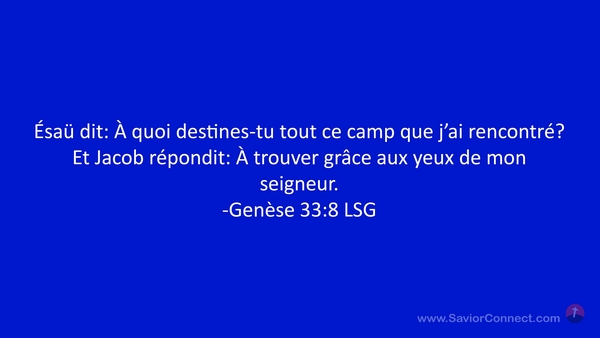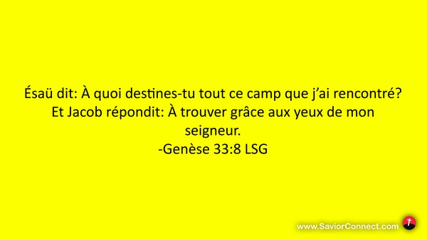 Ésaü dit: À quoi destines-tu tout ce camp que j'ai rencontré? Et Jacob répondit: À trouver grâce aux yeux de mon seigneur. -Genèse 33:8 LSG