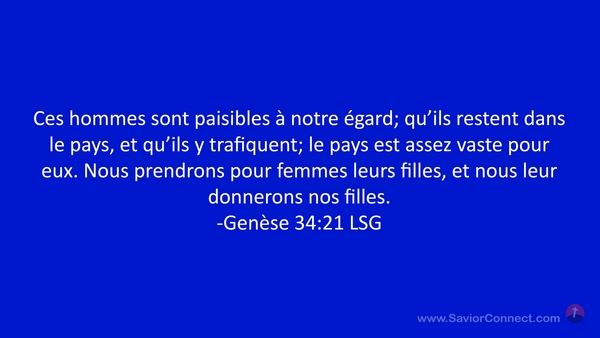 Ces hommes sont paisibles à notre égard; qu'ils restent dans le pays, et qu'ils y trafiquent; le pays est assez vaste pour eux. Nous prendrons pour femmes leurs filles, et nous leur donnerons nos filles. -Genèse 34:21 LSG