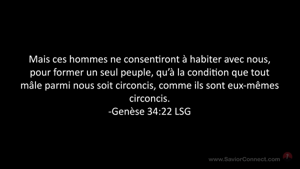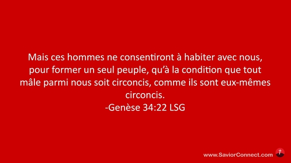 Mais ces hommes ne consentiront à habiter avec nous, pour former un seul peuple, qu'à la condition que tout mâle parmi nous soit circoncis, comme ils sont eux-mêmes circoncis. -Genèse 34:22 LSG