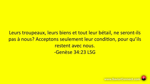Leurs troupeaux, leurs biens et tout leur bétail, ne seront-ils pas à nous? Acceptons seulement leur condition, pour qu'ils restent avec nous. -Genèse 34:23 LSG