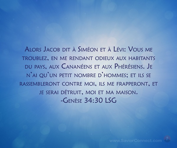 Alors Jacob dit à Siméon et à Lévi: Vous me troublez, en me rendant odieux aux habitants du pays, aux Cananéens et aux Phérésiens. Je n'ai qu'un petit nombre d'hommes; et ils se rassembleront contre moi, ils me frapperont, et je serai détruit, moi et ma maison. -Genèse 34:30 LSG