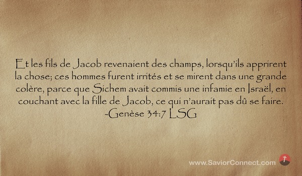 Et les fils de Jacob revenaient des champs, lorsqu'ils apprirent la chose; ces hommes furent irrités et se mirent dans une grande colère, parce que Sichem avait commis une infamie en Israël, en couchant avec la fille de Jacob, ce qui n'aurait pas dû se faire. -Genèse 34:7 LSG