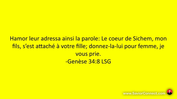 Hamor leur adressa ainsi la parole: Le coeur de Sichem, mon fils, s'est attaché à votre fille; donnez-la-lui pour femme, je vous prie. -Genèse 34:8 LSG
