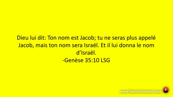 Dieu lui dit: Ton nom est Jacob; tu ne seras plus appelé Jacob, mais ton nom sera Israël. Et il lui donna le nom d'Israël. -Genèse 35:10 LSG