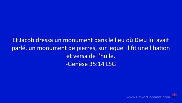 Et Jacob dressa un monument dans le lieu où Dieu lui avait parlé, un monument de pierres, sur lequel il fit une libation et versa de l'huile. -Genèse 35:14 LSG